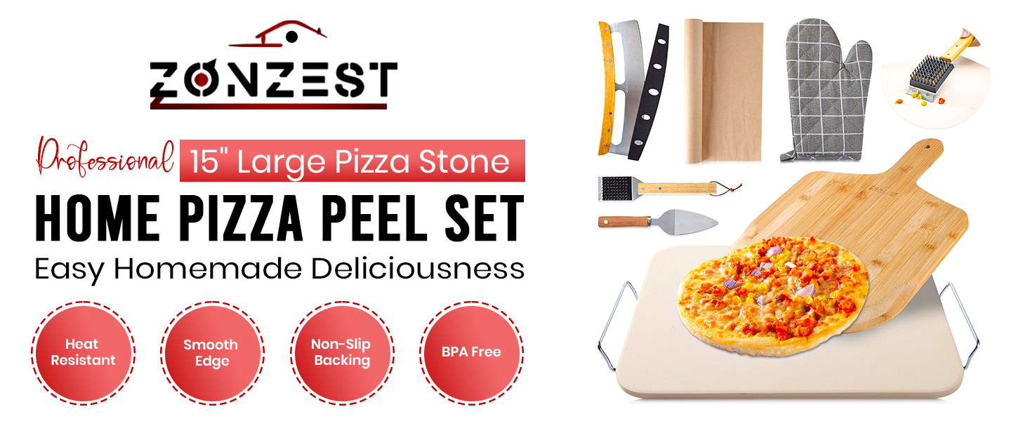 • 【8 PCS Convenience】 The ZONZEST ceramic pizza stone set has everything for perfect homemade pizzas. It includes a pizza stone handle, bamboo pizza peel, rocker cutter, pizza server, heat-resistant gloves, 10 parchment papers, and a stone scraper with a grill brush for easy cleaning. This all-in-one kit makes professional-quality pizza effortless!