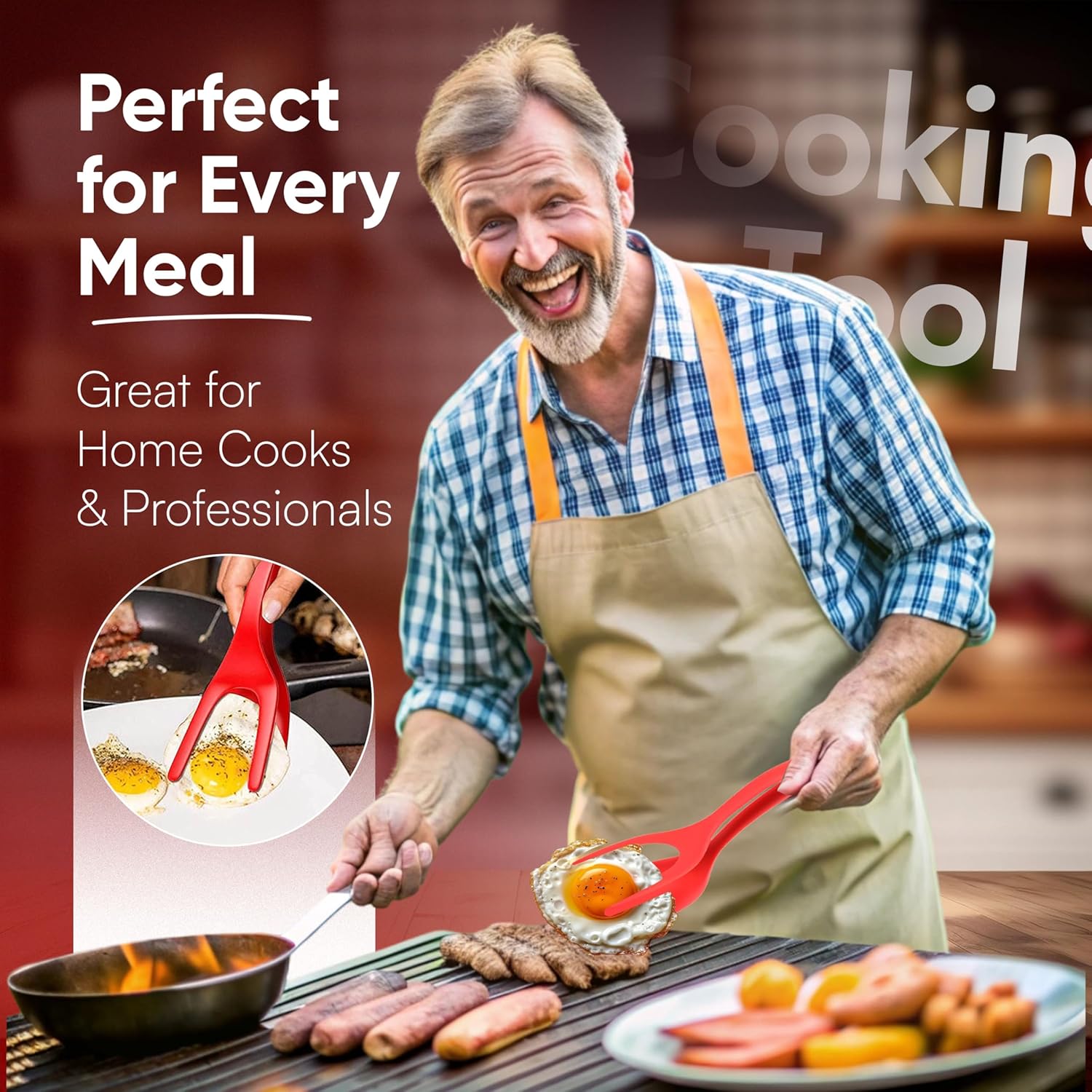 Egg Flipper Spatula Tongs (Set of 2) – Non-Stick 2-in-1 Grip & Flip Kitchen Tongs for Pancakes, Fish, Eggs, and More – Heat Resistant Cooking Tool (Black + Red)